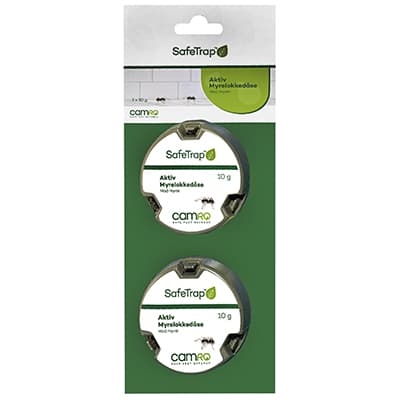 SafeTrap Myrelokkedåser leveres i en praktisk 2-pak og er udviklet til målrettet at fjerne hele myreboet, ikke kun de synlige myrer.